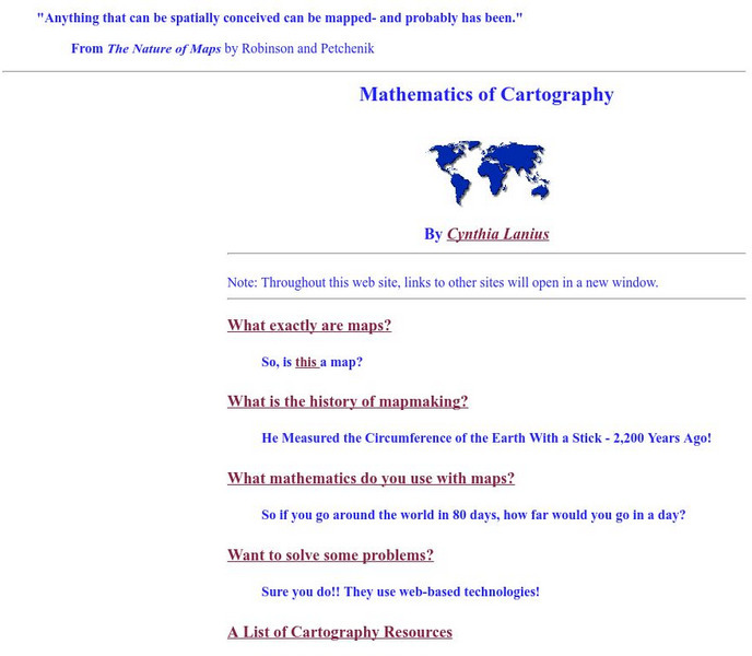 Can there be a connection between map making and math? Explore the mathematics of cartography in this resource that integrates web-based instruction, mathematical problem solving, geometry, history, and art. Interesting information and...