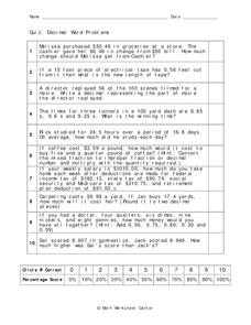 In this decimals worksheet, students solve 10 different word problems that include using decimals. First, they determine the amount of change received from a cashier given a specific amount. Then, students write a decimal representing...