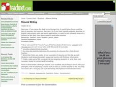 Students research examples of resumes on the World Wide Web. They use the good examples to write their own resumes focusing on their strengths.