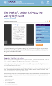 The civil rights movement: An ongoing battle for change. The activity focuses on President Johnson's speech in response to the massacre at the Selma March. Academics study the speech, complete a hands-on-activity, and discuss President...