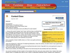 Students practice identifying the meanings of unknown words using context clues. In this vocabulary lesson, students read sentences which contain an unknown words. They will use the context of the sentence to determine the meaning.