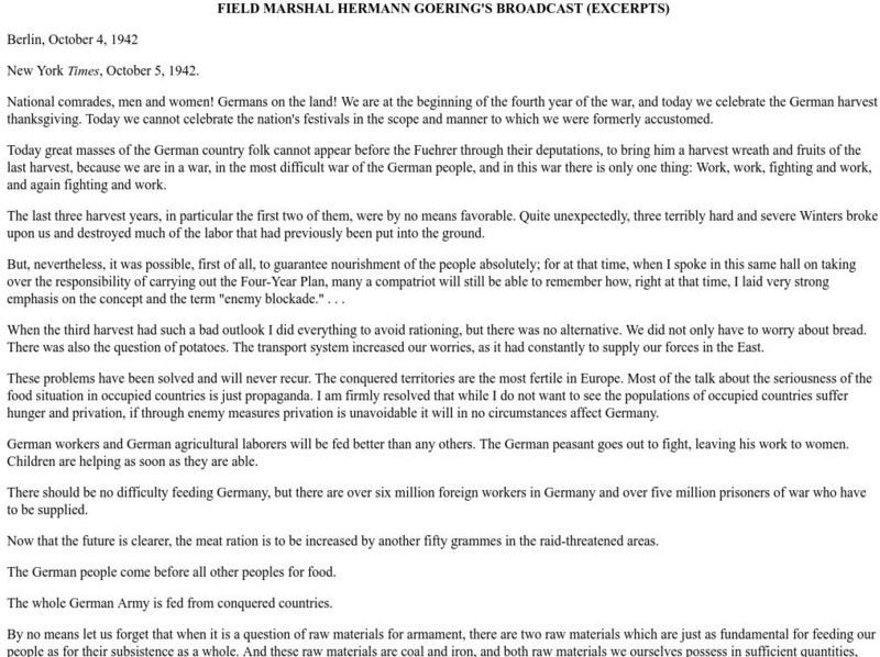 Provided from ibiblio.org are excerpts of a speech that Field Marshal Hermann Goering gave to the German people to rally support for the war effort on October 4, 1942.