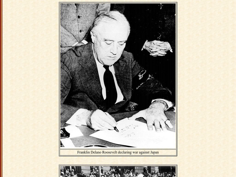 Images from different times during World War II. Shows not only images of famous people but also images of propaganda encouraging people to conserve resources used in the United States throughout the war.