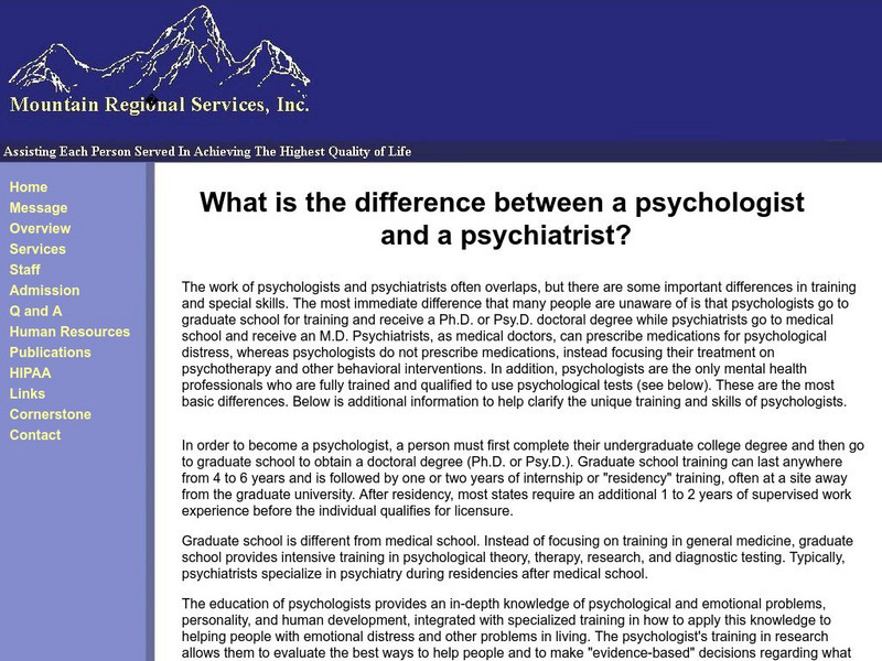 Mountain Regional Services provides a description and describes the differences of psychologist and psychiatrist.