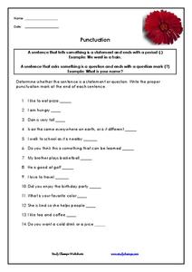 Your never to young to know where to put commas, periods, or question marks. Little learners practice their punctuation by completing a developmentally appropriate worksheet, perfect for developing readers. They'll punctuate 10 sentences...