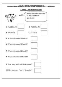 Sometimes, written addition problems can confuse students. In this addition instructional activity, students find sums for 10 written questions such as: "Find the sum of 30 and 50."