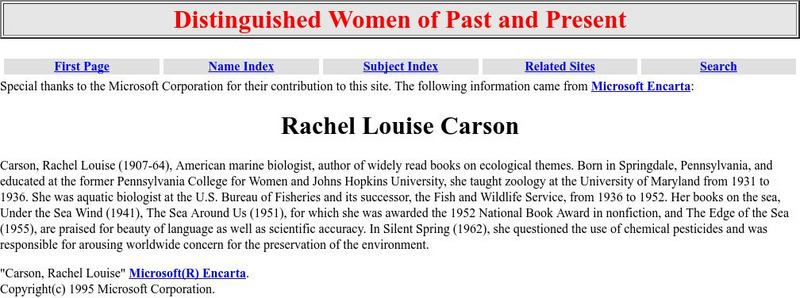 This site provides a brief biography of the American marine biologist and author, Rachel Louise Carson.