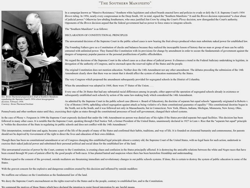 The Southern Manifesto, written in opposition to the racial integration of public places and condemning the Supreme Court's 1954 school desegregation decision, was signed by 101 congressmen from the Deep South.