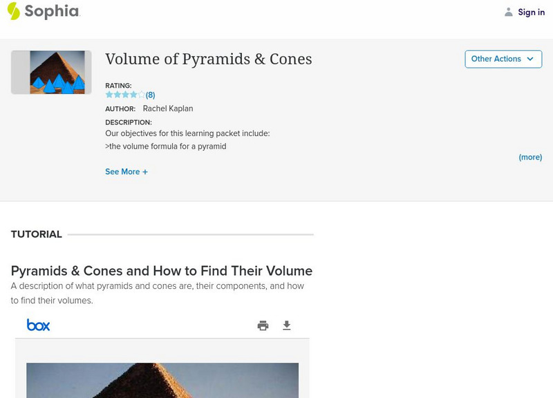 The mathematics resource includes material that explores the volume of pyramids and cones. Definitions, examples, and video lessons investigate the geometry concepts.