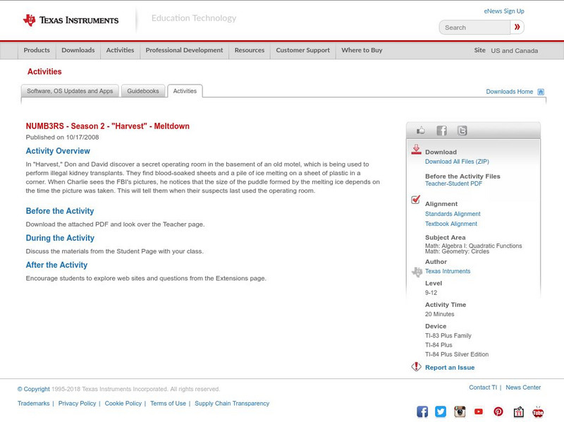 Based off of the hit television show NUMB3RS, this lesson has students explore the relationship between a circle's area and it's radius. This is framed in the context of a scene in where a pile of ice is melting into an increasingly...