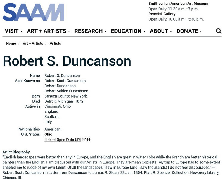 As part of the Smithsonian Art Museum's database of artists, this site provides in-depth biographical information on Robert S. Duncanson in addition to an extensive listing of his works as displayed at the museum.