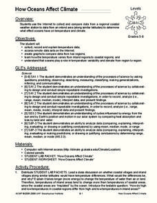 Learners draw conclusions about how the ocean affects temperature. In this weather lesson, students use the Internet to gather data to help them come to a conclusion about how the climate in a certain region is directly affected by the...