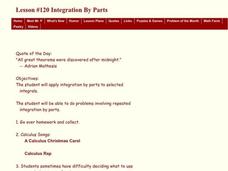Students explore integration by parts and use it to solve equations. In this calculus instructional activity, students sing a song about integration, and practice solving equations using integration by parts twice. They solve integrals...