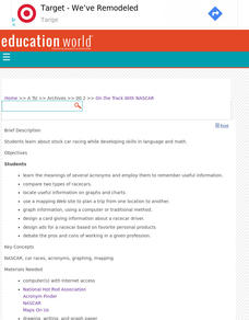 Students complete a variety of activities to research stock car racing. They use the Internet to research NASCAR acronyms, schedules, results, car design and other aspects.