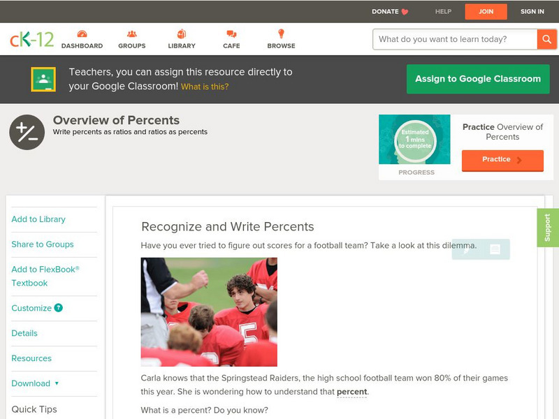 This Math Page tutorial explains how percents are ratios and then features a practice exercise.