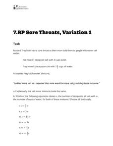 Why does Nia's water taste saltier than Trey's if she put more into her cup than he did? Math masters set up proportions in order to compare the mixtures. This task effectively has learners apply the concepts of ratio and proportion to a...