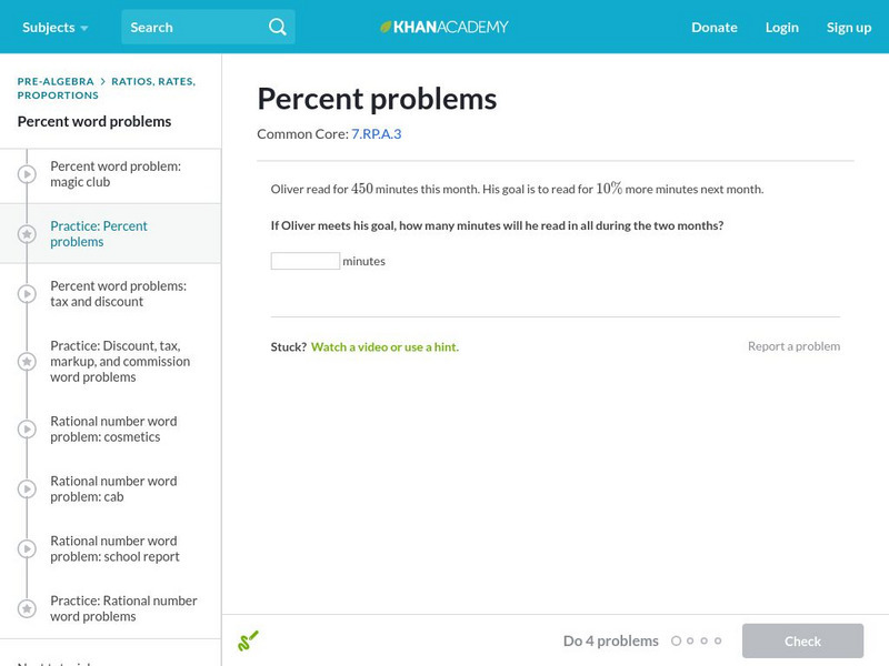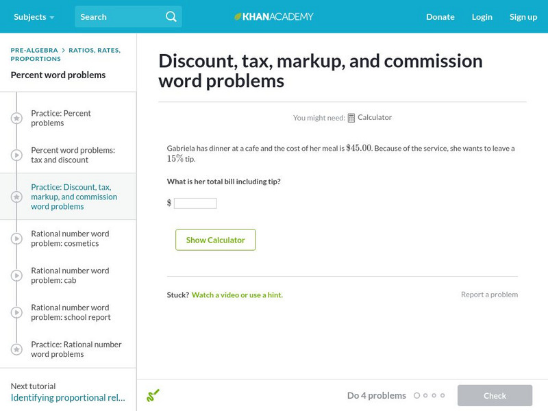 Practice solving word problems involving price discounts, taxes, and tip calculations. Students receive immediate feedback and have the opportunity to try questions repeatedly, watch a video or receive hints.
