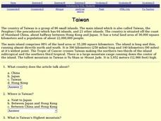 In this Taiwan activity, students complete a 10 question multiple choice on-line interactive quiz pertaining to facts about the island country of Taiwan.