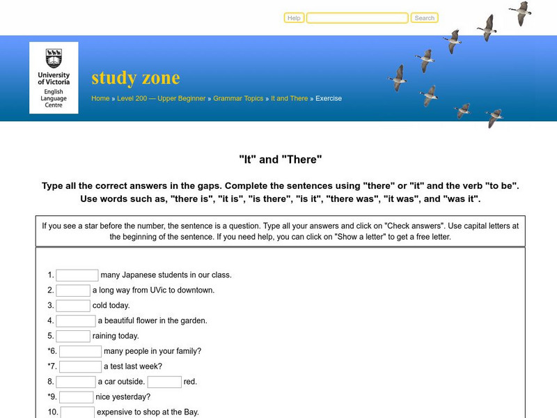 Brief interactive exercise on proper usage of "there is," "it is," "is there," "is it," "there was," "it was," "was it," etc. Twelve questions, the student types in the blank & can then check the answer or get a hint.