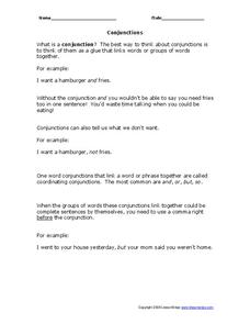 In this grammar worksheet, students learn about conjunctions in sentence writing. They then use what they read to answer the 12 questions on the page. The answers are located on the last page of the packet.