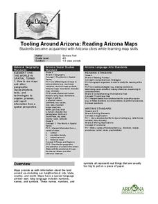 Students study geography. In this Arizona maps lesson, students develop their map reading skills. They have class discussions and work independently with various copies of Arizona maps to practice those skills. This lesson mentions...