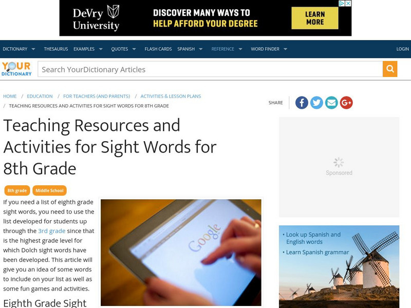 Your Dictionary: Teaching Resources and Activities for Sight Words for 8th Grade