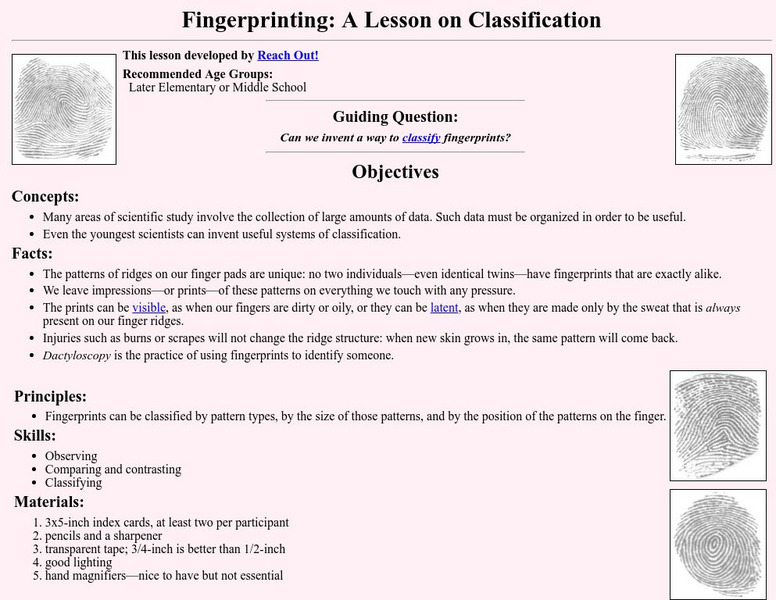Who done it? Basic lesson plan to classify fingerprints. Students can classify their own and classmates fingerprints by taking prints and comparing them to the handout provided.