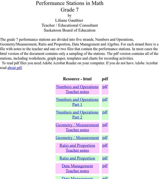 University of Regina: Math Central: Performance Stations in Math: Grade 7