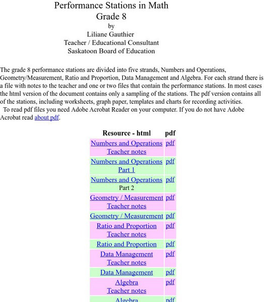 University of Regina: Math Central: Performance Stations in Math: Grade 8