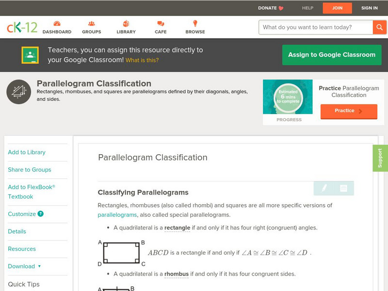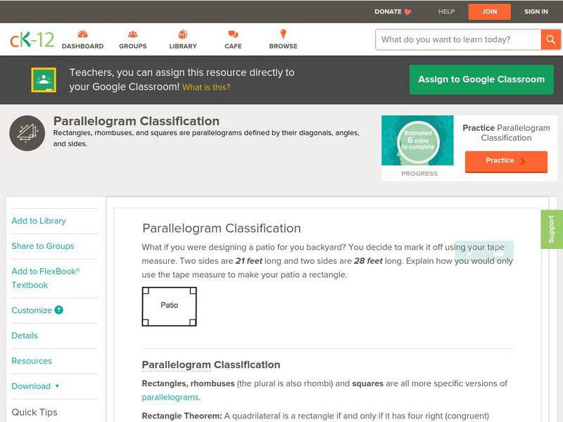 [Free Registration/Login may be required to access all resource tools.] Classify a parallelograms as a rhombus, rectangle, or square.