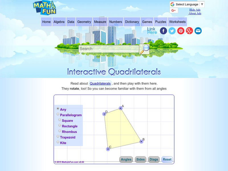 Resize and rotate different types of quadrilaterals--square, rectangle, rhombus, trapezoid, and kite--while learning the definitions of these different shapes and labeling the angles and diagonals. CCSS.Math.Content.3.G.A.1 Understand...