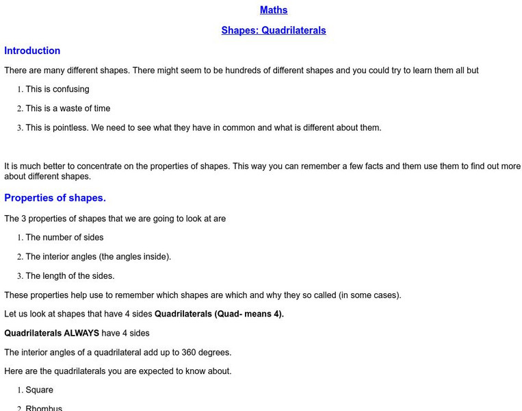 Are you looking for a very basic website that will explain the basic properties of a quadrilateral? Use this site to learn about the properties of a square, rhombus, rectangle, parallelogram, trapezoid, and kite. There are also some...