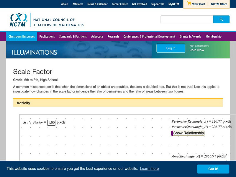 The interactive applet allows learners to explore the relationships between side length, area, and perimeter. Students see how changes in the scale factor influence the ratio of areas and perimeters. [Requires Java.]