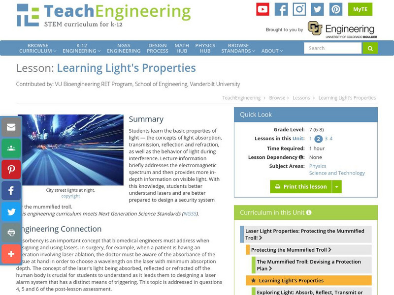 Students learn the basic properties of light--the concepts of light absorption, transmission, reflection and refraction, as well as the behavior of light during interference. Lecture information briefly addresses the electromagnetic...