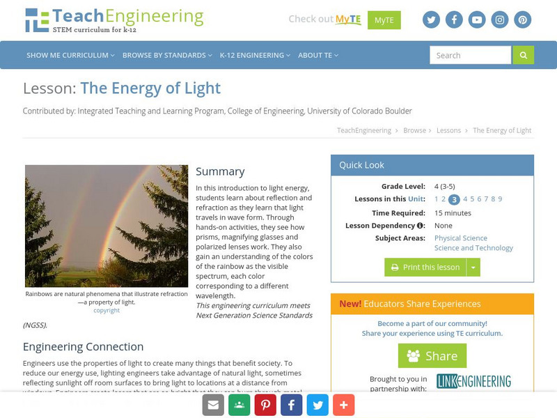 For this introduction to light energy, students learn about reflection and refraction as they learn that light travels in wave form. Through hands-on activities, they see how prisms, magnifying glasses and polarized lenses work. They...