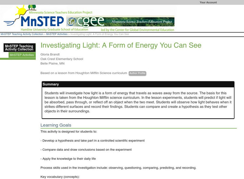 Students will investigate how light is a form of energy that travels as waves away from the source. The basis for this lesson is taken from the Houghton Mifflin science curriculum. In the lesson experiments, students will predict if...