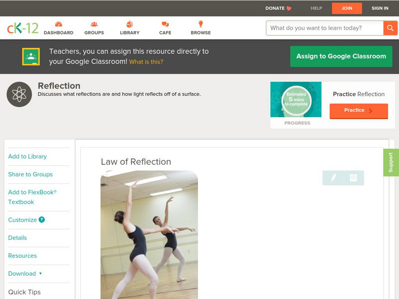[Free Registration/Login may be required to access all resource tools.] Reflection and how it produces an image, regular and diffuse reflection and the law of reflection.
