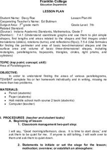 Seventh graders review the process of finding the area of a rectangle and complete a couple of examples as a class. They discuss what a parallelogram is and what the formula would be for finding its area. They listen to an explanation...