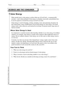 In this solar energy worksheet, students read about the uses of solar energy, the benefits and the costs. They answer four critical thinking questions about solar energy.