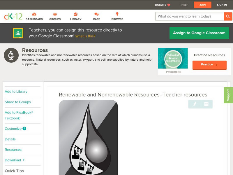 [Free Registration/Login may be required to access all resource tools.] Identifies renewable and nonrenewable resources based on the rate at which humans use a resource. Natural resources, such as water, oxygen, and soil, are supplied by...