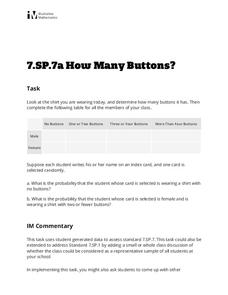 Bring the class into the probability by having everyone count buttons on their shirts. Organize the data into the chart provided and chose different possibilities such as "female with one button" or "all students with more than four...