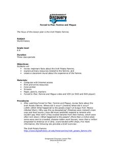 Students examine events the lead people to emigrate. In this Irish Potato Famine lesson, students research primary and secondary sources regarding the Irish Potato Famine and collaborate to create a classroom mural depicting the famine...