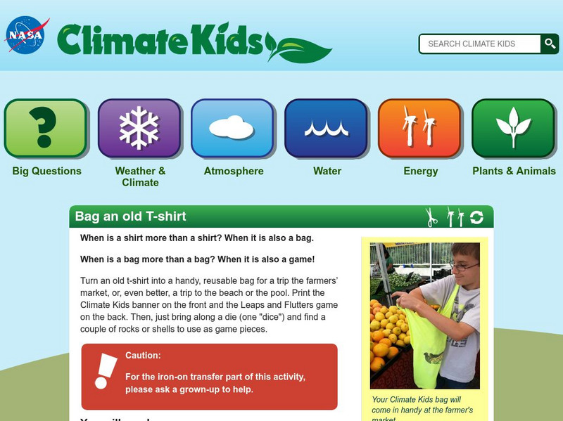 Turn an old t-shirt into a reusable shopping bag for a trip the market, or even to the pool. Then, print the Climate Kids banner on the front and the Leaps and Flutters game on the back. Bring along a die, and find a couple of rocks or...