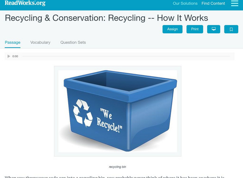 [Free Registration/Login Required] An informational text about recycling to reduce trash in landfills. A question sheet is available to help students build skills in reading comprehension.