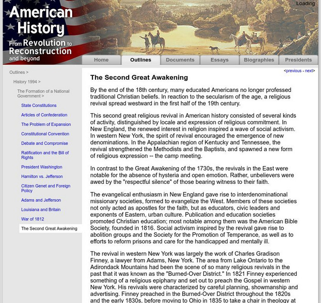 This university site offers a detailed summary the U.S. religious revival called the Second Great Awakening. Looks at various religious movements in the early United States.