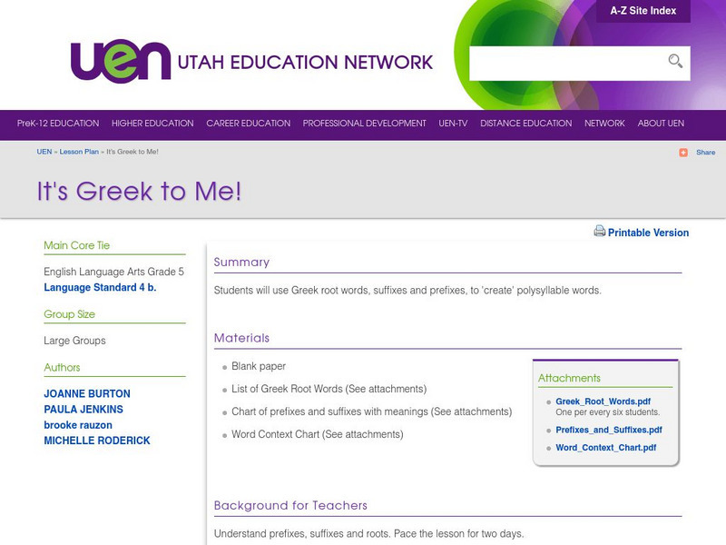 Contains plans for three lessons that teach about root words, prefixes, and suffixes using handouts, websites, and games. In addition to objectives and standards, this instructional plan contains links to sites used in the lessons as...