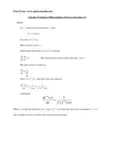 In this differentiating special functions worksheet, students solve and complete 5 various types of problems. First, they differentiate each of the given functions. Then, students complete the table using a calculator and plot the points...