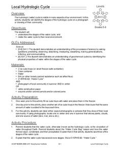 Learners draw the water cycle as it occurs in their community. For this water cycle lesson, students observe demonstrations of sublimation and infiltration. They also use photographs or their own drawings of their...