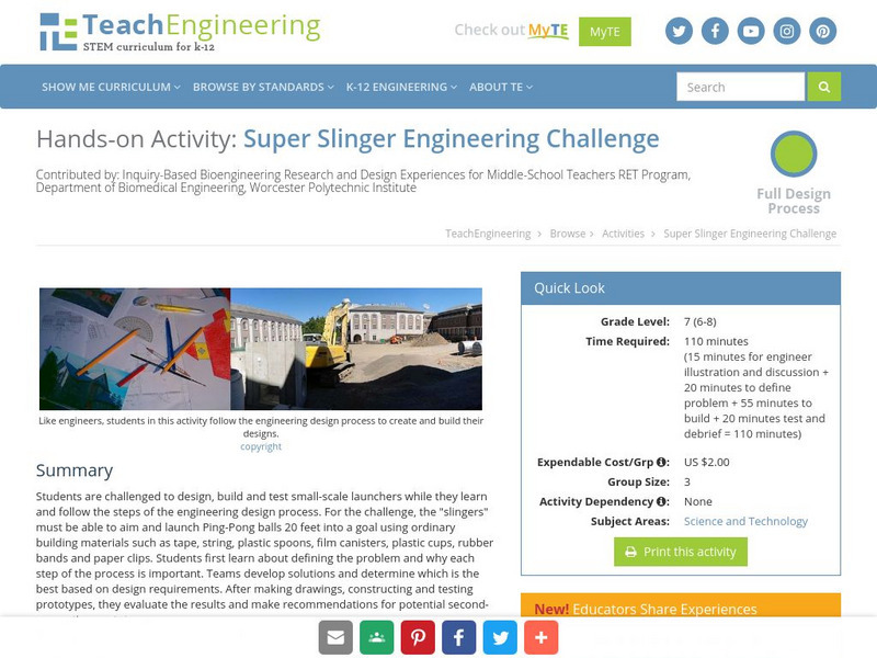 Students are challenged to design, build and test small-scale launchers while they learn and follow the steps of the engineering design process. For the challenge, the "slingers" must be able to aim and launch Ping-Pong balls 20 feet...