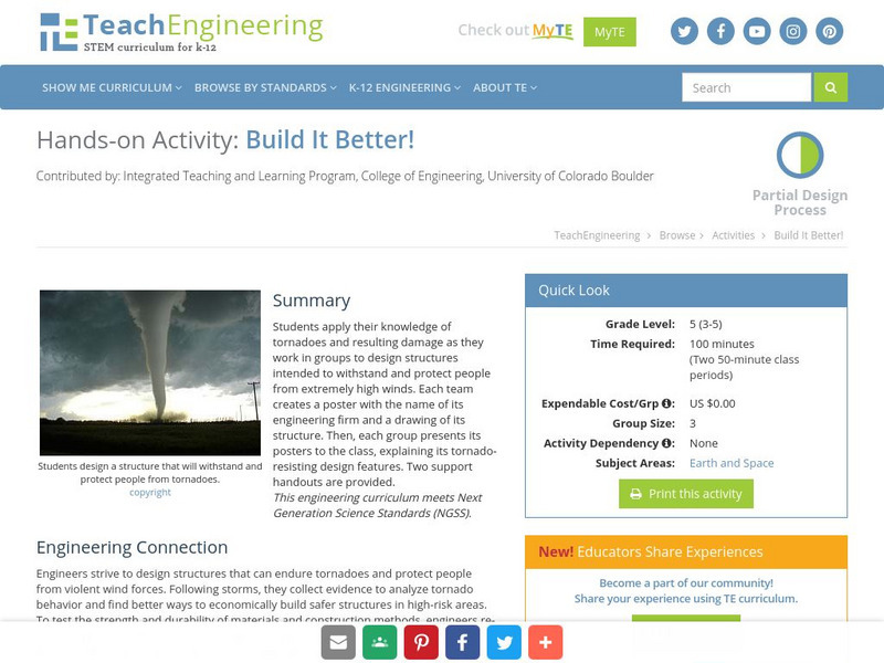 Students learn about tornados and how engineers design structures to better withstand them. Students then design and draw a house that will better withstand a tornado. Students also learn about the Fujita Tornado Damage Score.